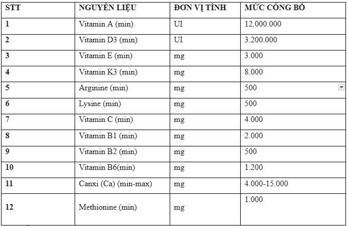 Vitamin A, Vitamin D3, Vitamin E, Vitamin K3, Arginine, Lysine, Methionine, Vitamin C, Vitamin B1, Vitamin B2, Vitamin B6, Calcium Carbonate, dung môi vừa đủ.